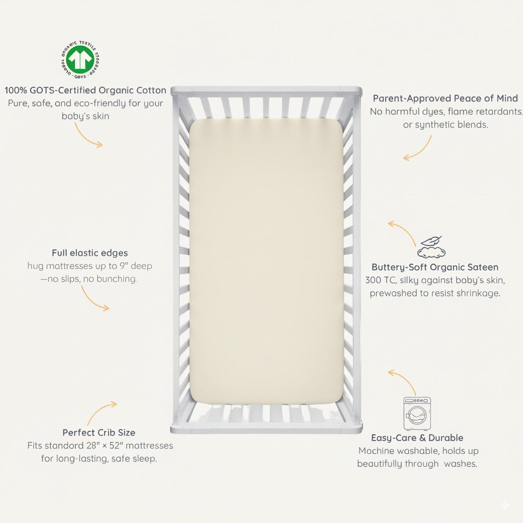 Envelop your precious little one in the lap of luxury with our stunning crib sheet, crafted with the finest 100% organic cotton sateen. Silky soft and exquisitely finished, this sheet provides a sumptuous sleeping experience that will transport your baby to a world of comfort and relaxation. The fitted design ensures a snug and secure fit, while the timeless hues of our sophisticated color palette effortlessly complement any nursery decor.