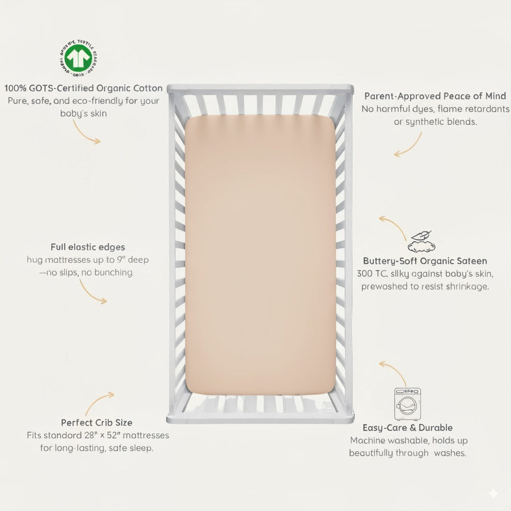Envelop your precious little one in the lap of luxury with our stunning crib sheet, crafted with the finest 100% organic cotton sateen. Silky soft and exquisitely finished, this sheet provides a sumptuous sleeping experience that will transport your baby to a world of comfort and relaxation. The fitted design ensures a snug and secure fit, while the timeless hues of our sophisticated color palette effortlessly complement any nursery decor.