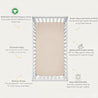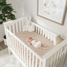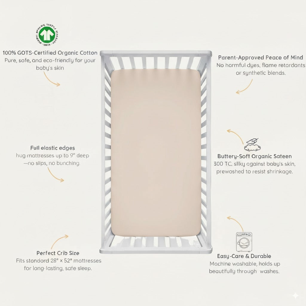 Envelop your precious little one in the lap of luxury with our stunning crib sheet, crafted with the finest 100% organic cotton sateen. Silky soft and exquisitely finished, this sheet provides a sumptuous sleeping experience that will transport your baby to a world of comfort and relaxation. The fitted design ensures a snug and secure fit, while the timeless hues of our sophisticated color palette effortlessly complement any nursery decor.