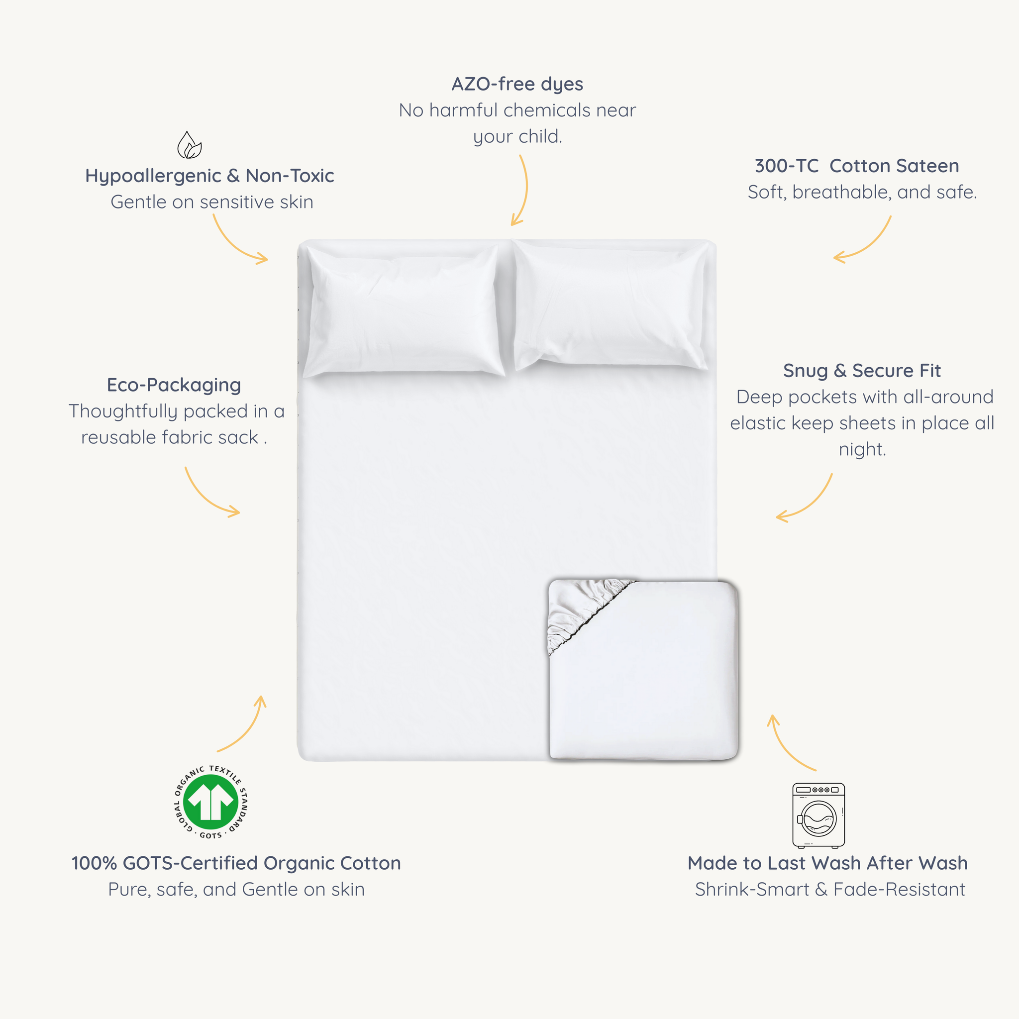 Transform your child's bedroom into a cozy and playful wonderland with our organic cotton sheet set! Made with the softest premium organic cotton 300 TC sateen, this fitted sheet set is the ultimate in luxurious and safe bedding for toddlers and kids. With a silky smooth texture and a range of fun colors to choose from, your child will love snuggling up in their new sheets every night. And as a parent, you can rest easy knowing that your child is surrounded by natural, chemical-free organic cotton.