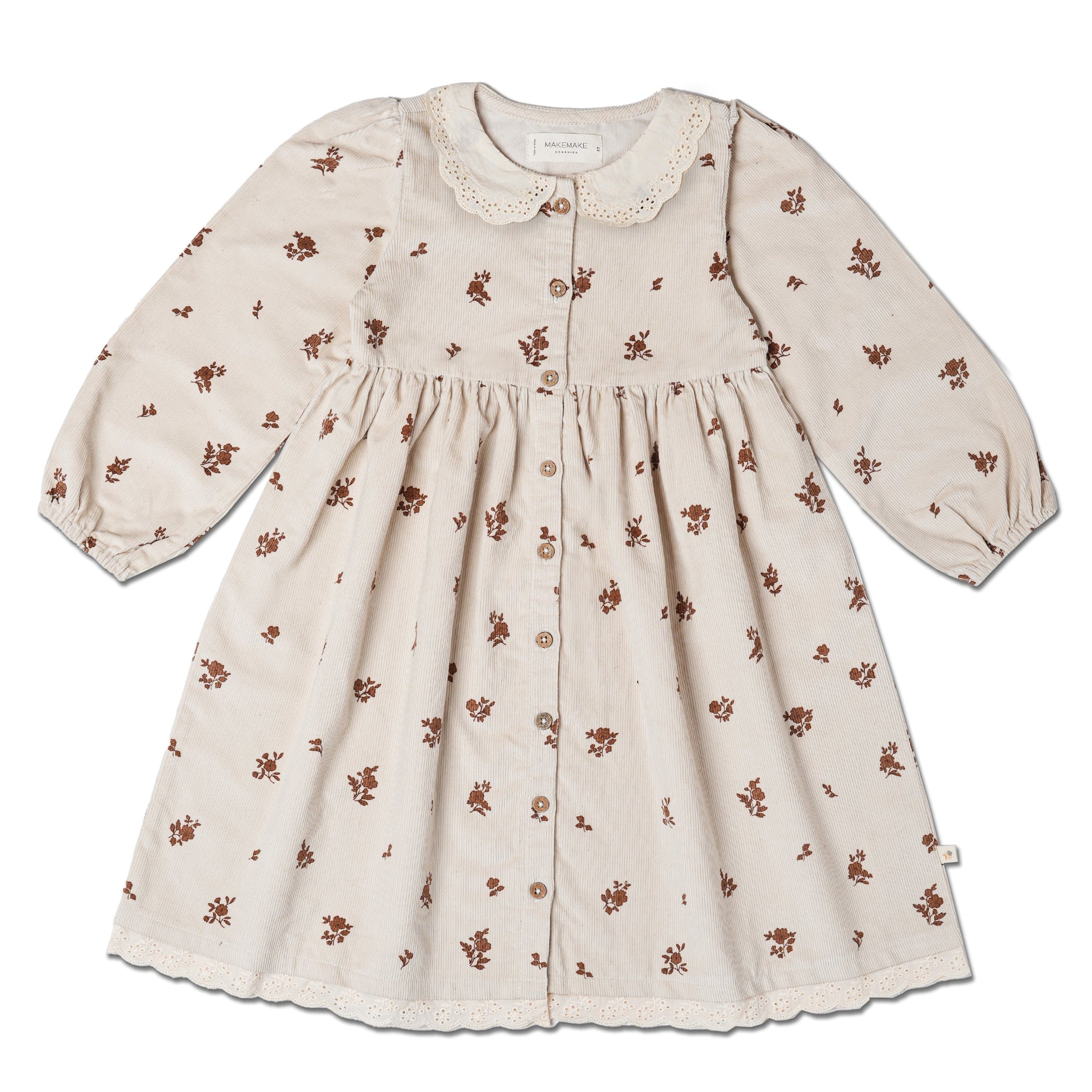 Organic Corduroy Collared Button Dress - Brown Floral