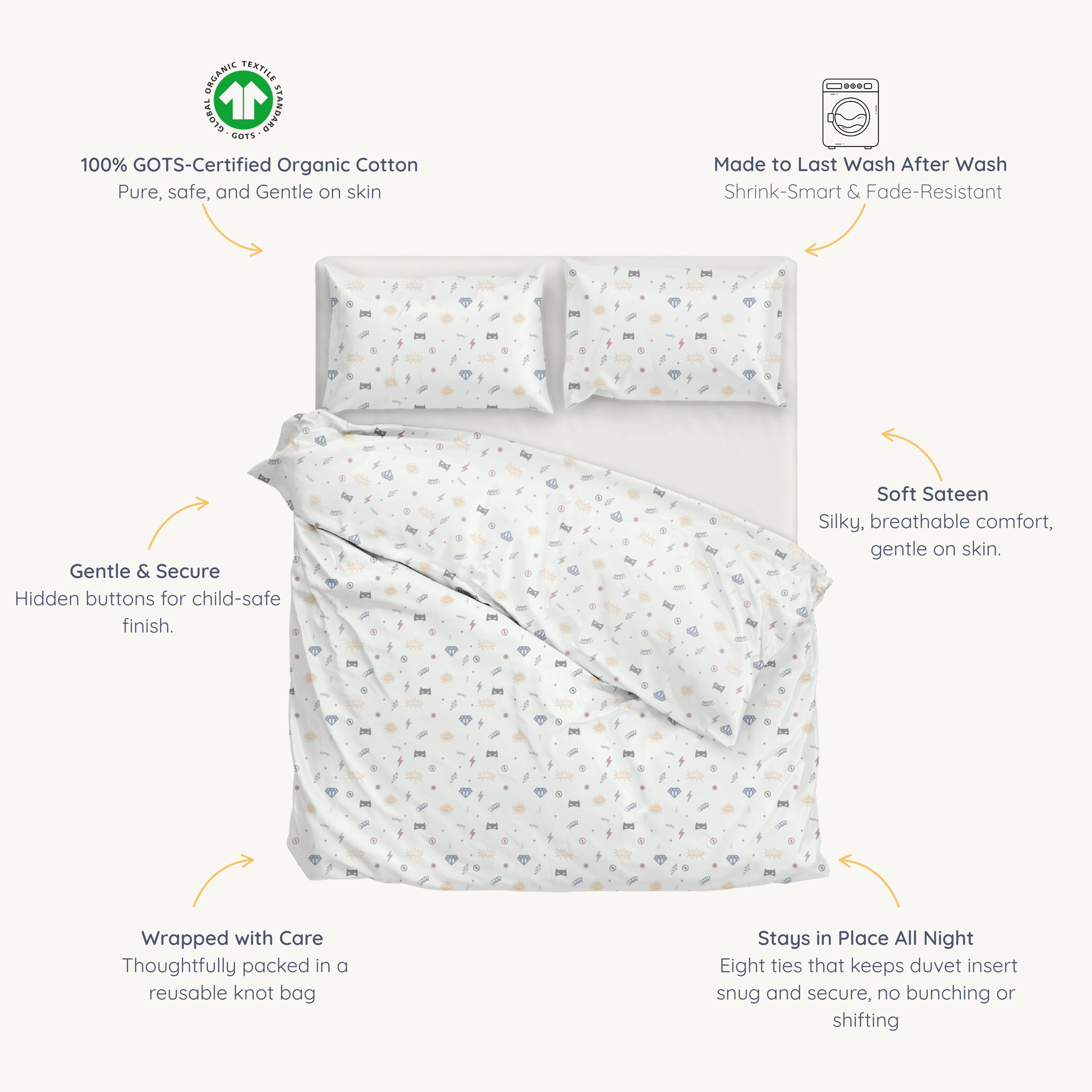 Elevate your child's sleeping experience to new heights of comfort and luxury with our stunning organic duvet covers, specially crafted for toddlers and kids. Made from the finest organic cotton sateen, our duvet covers offer an exquisite softness and breathability, ensuring a restful and refreshing sleep every night. The stylish and sophisticated design is available in a range of elegant colors, adding a touch of refined elegance to any bedroom decor.
