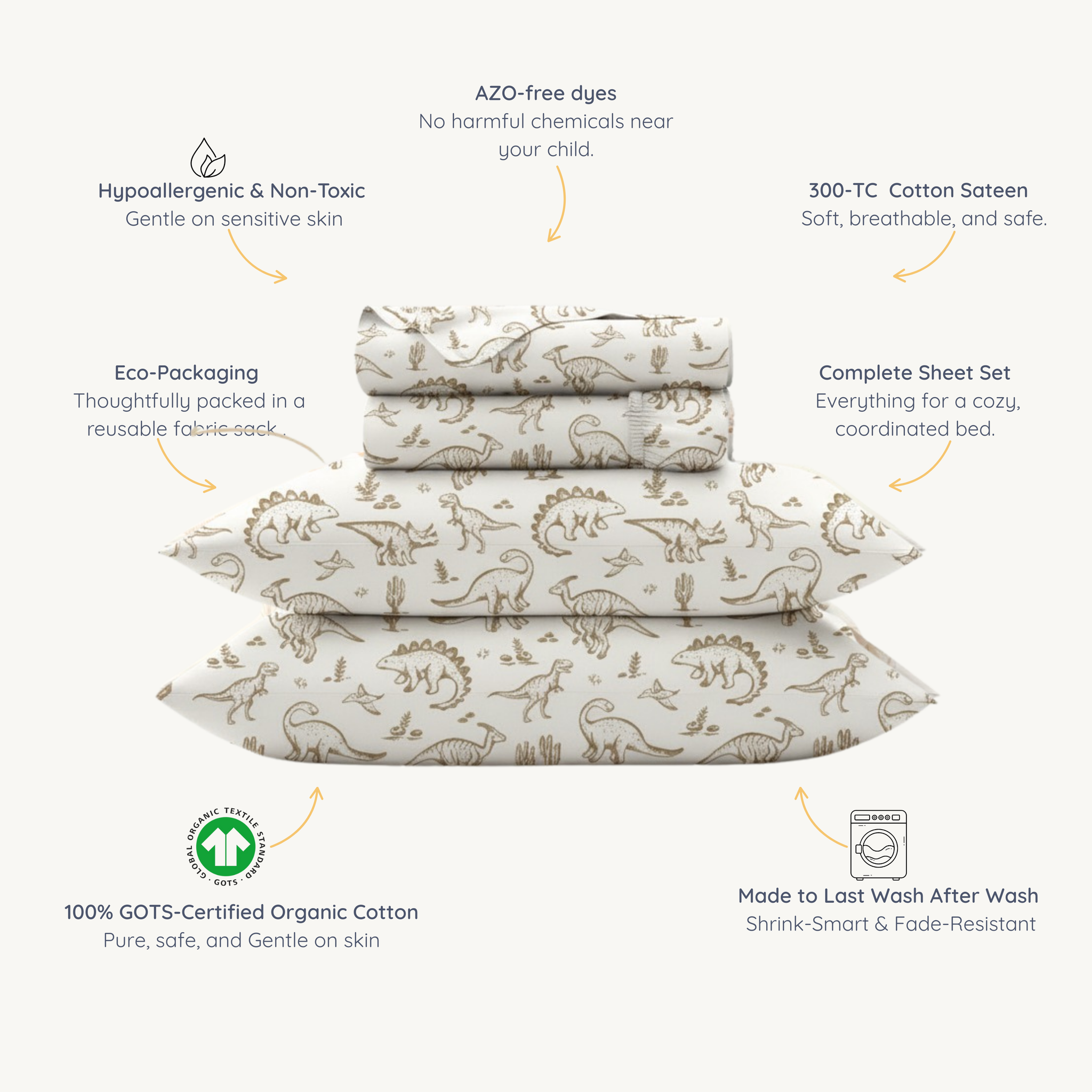 Transform your child's bedroom into a cozy and playful wonderland with our organic cotton sheet set! Made with the softest premium organic cotton 300 TC sateen, this sheet set is the ultimate in luxurious and safe bedding for toddlers and kids. With a silky smooth texture and a range of fun colors to choose from, your child will love snuggling up in their new sheets every night. And as a parent, you can rest easy knowing that your child is surrounded by natural, chemical-free organic cotton.