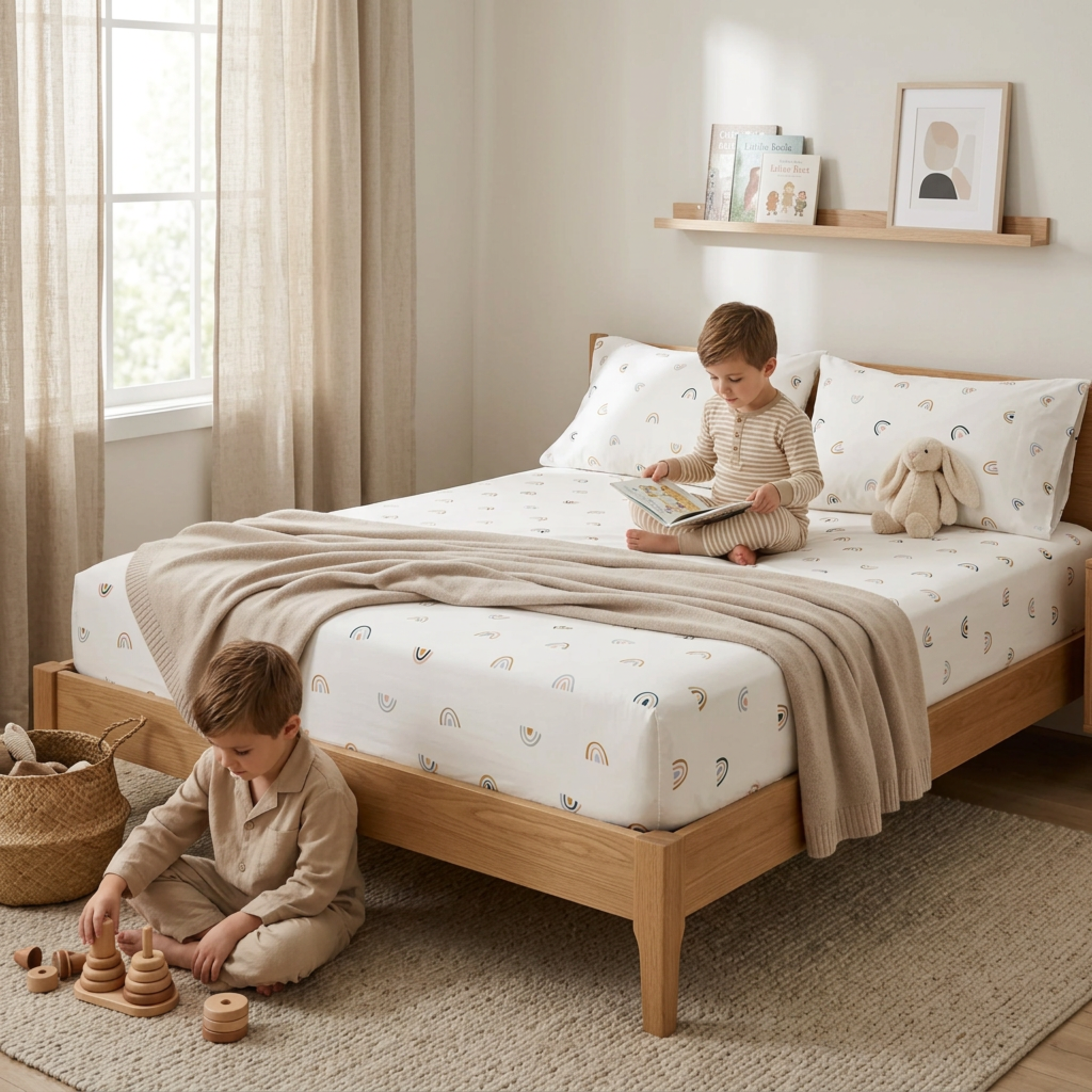 Transform your child's bedroom into a cozy and playful wonderland with our organic cotton sheet set! Made with the softest premium organic cotton 300 TC sateen, this fitted sheet set is the ultimate in luxurious and safe bedding for toddlers and kids. With a silky smooth texture and a range of fun colors to choose from, your child will love snuggling up in their new sheets every night. And as a parent, you can rest easy knowing that your child is surrounded by natural, chemical-free organic cotton.